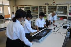 グループで琴、電子ピアノ、木琴などの音をオシロスコープで観察しました。